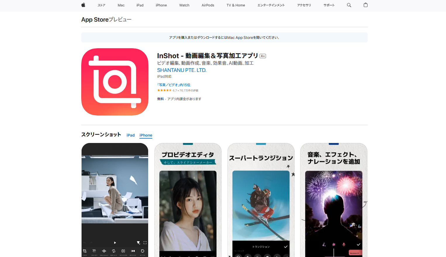 InShotは、SNS用の動画編集に特化している動画編集アプリです。カット・トリミング・BGM挿入・モザイク処理・倍速・反転など必要な機能が一通り揃っています。HD出力にも対応しているので、画質もよいでしょう。