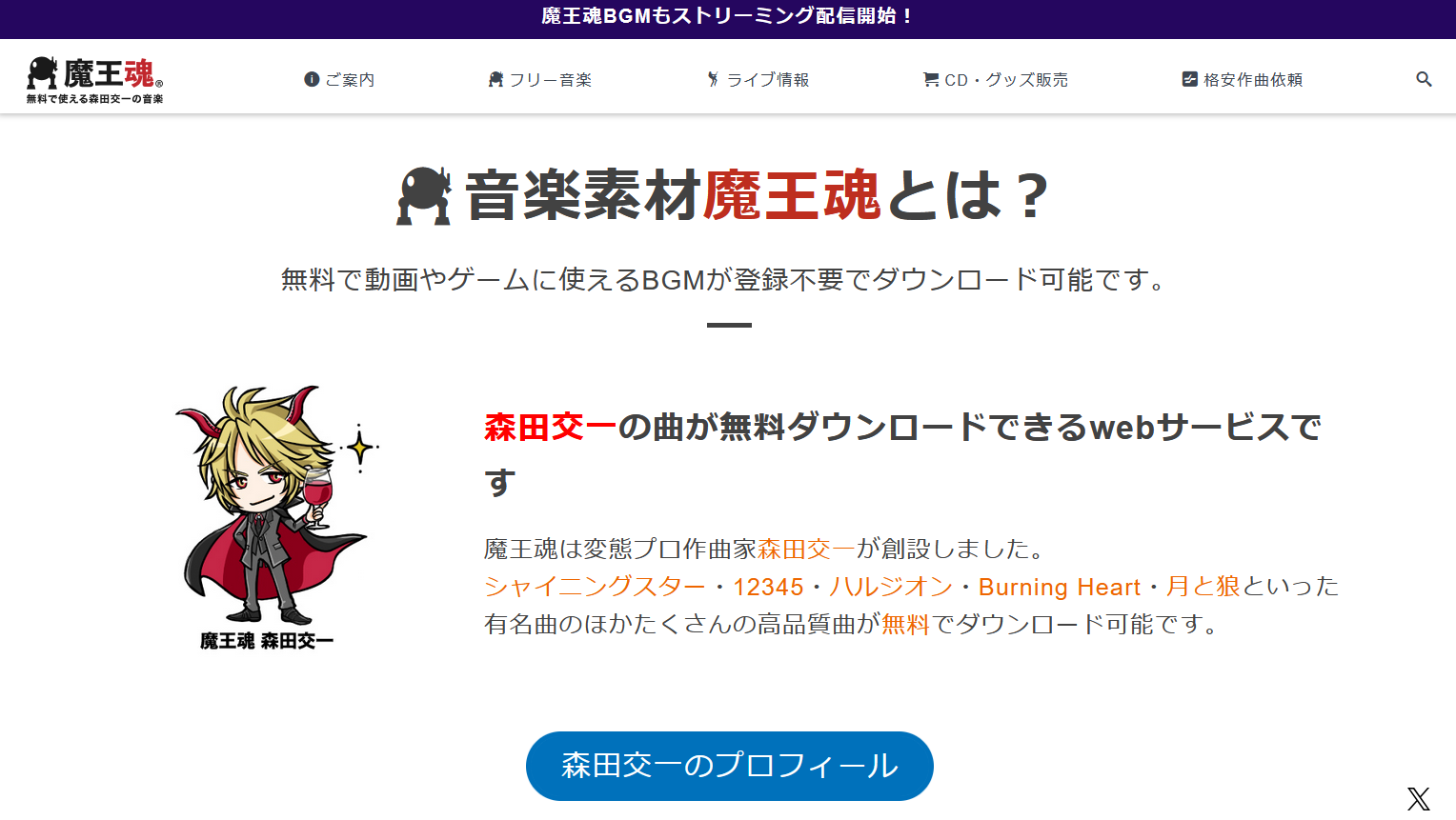 魔王魂は、森田交一さんが作曲した楽曲の無料配布を行っているWebサイトです。古くからYouTuberやゲーム制作者が魔王魂の音源を愛用しており、月間平均150万PVと驚異的なPV数を稼ぐ人気の無料音源配布サイトの1つです。