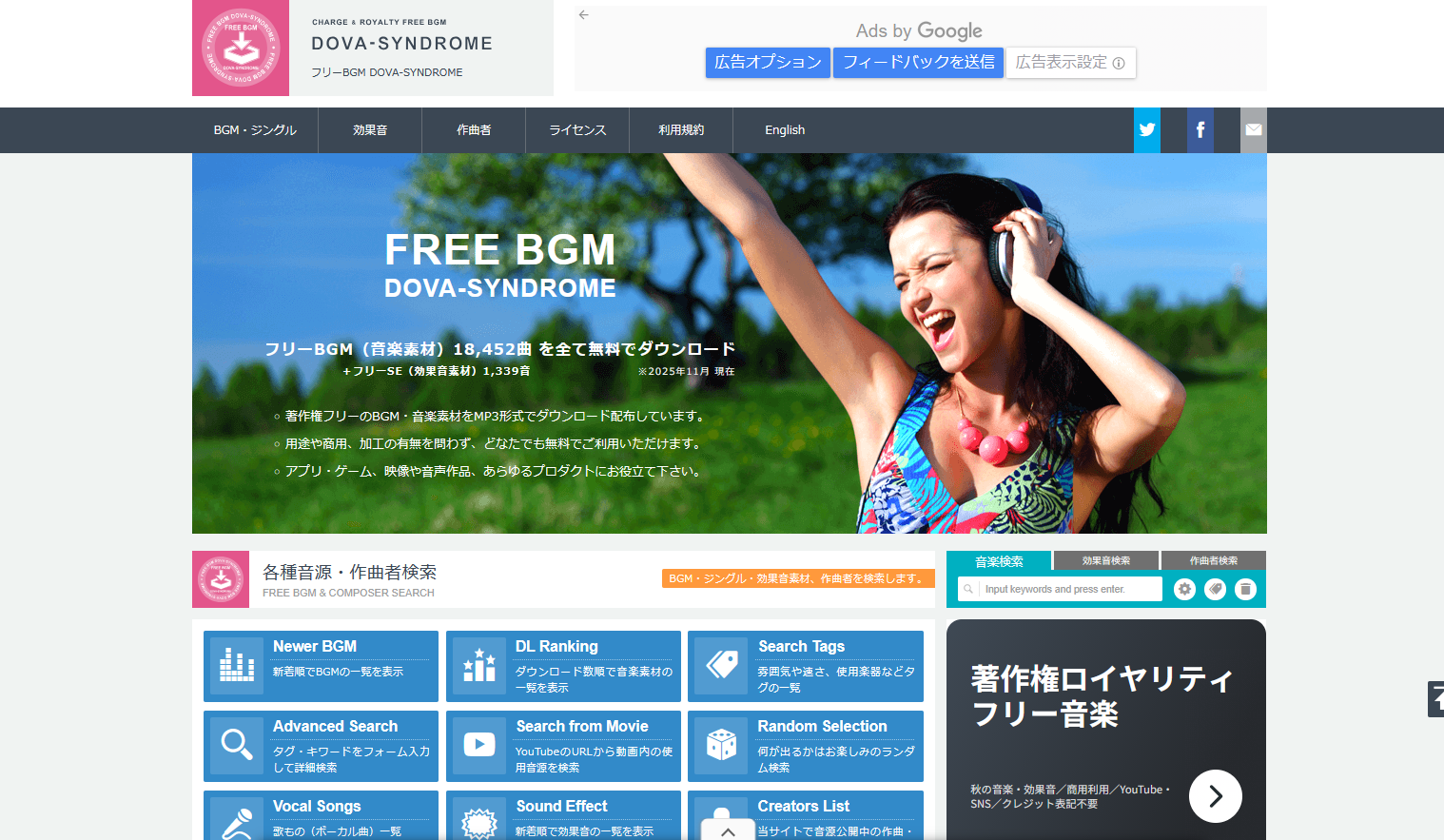 DOVA-SYNDROMEは、複数の作曲者が登録し、自身が制作した楽曲を配布しているWebサイトです。1万8000曲以上のフリーBGMが配布されており、フリーSEもたくさんが配布されている点が魅力的といえます。
