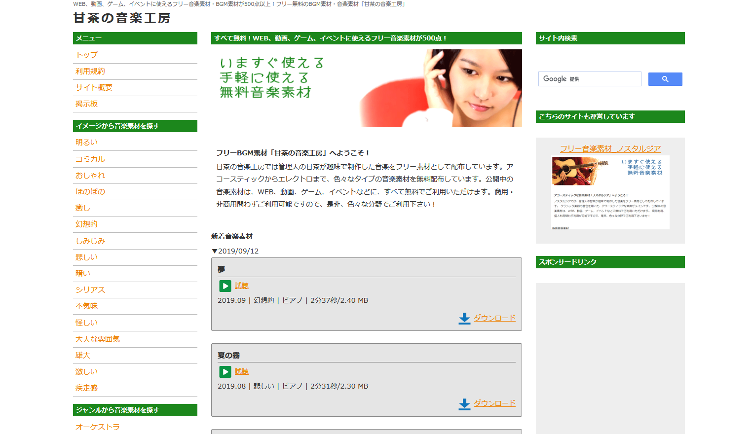 甘茶の音楽工房は、管理人の甘茶さんが制作した音楽を無料配布しているWebサイトです。アコースティックからエレクトロまでさまざまなジャンルの楽曲が配布されています。商用利用可能で著作権表記も任意(「してもらえると嬉しいです」と記載)のため、収益化がされているYouTubeチャンネルでも使用可能です。