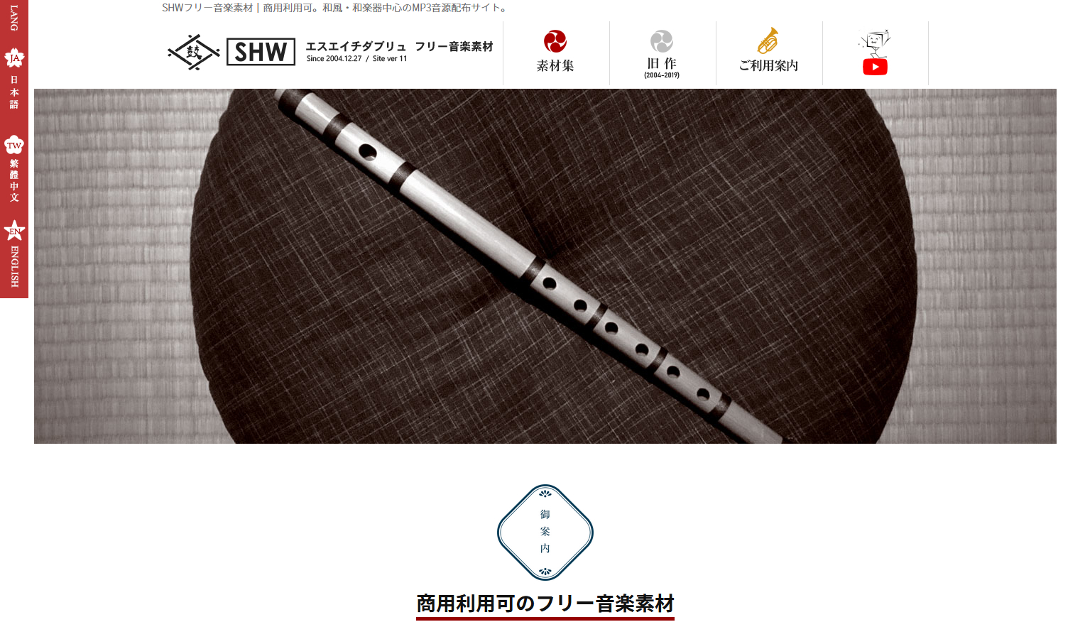 SHWは、和風な楽曲に特化したフリー音源を配布しているWebサイトです。音源素材配布サイトのなかでも特に利用規約が簡素な点が特徴です。著作権を保有している管理人さんの「きわめてオープンにやろう!」という意向から、著作権表記不要・商用利用可能・利用報告不要と非常に使いやすい音源配布サイトとなっています。管理人さんが「よさこい」の楽曲制作をされていることもあり、高いクオリティの和風テイストな楽曲が多数配布されていることが魅力の一つといえるでしょう。