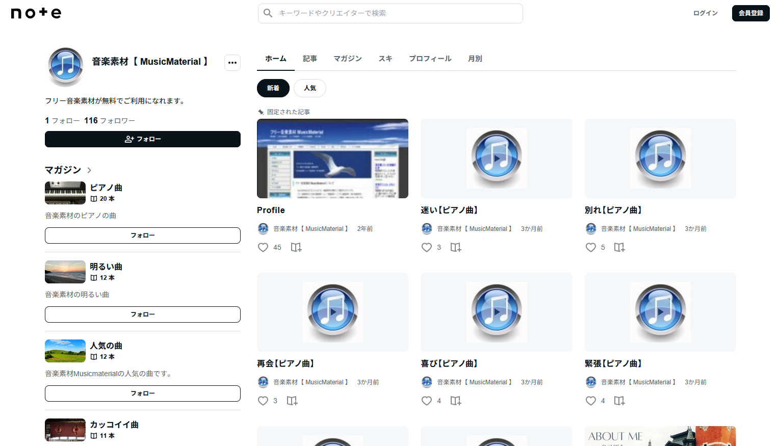 MusicMaterialは、さまざまなジャンルのBGMやMIDI素材を配布しています。YouTube動画でも利用頻度の高いループ素材を数多く配布している点が特徴です。MusicMaterialで配布されている音源は、著作権表記不要・商用利用可能です。