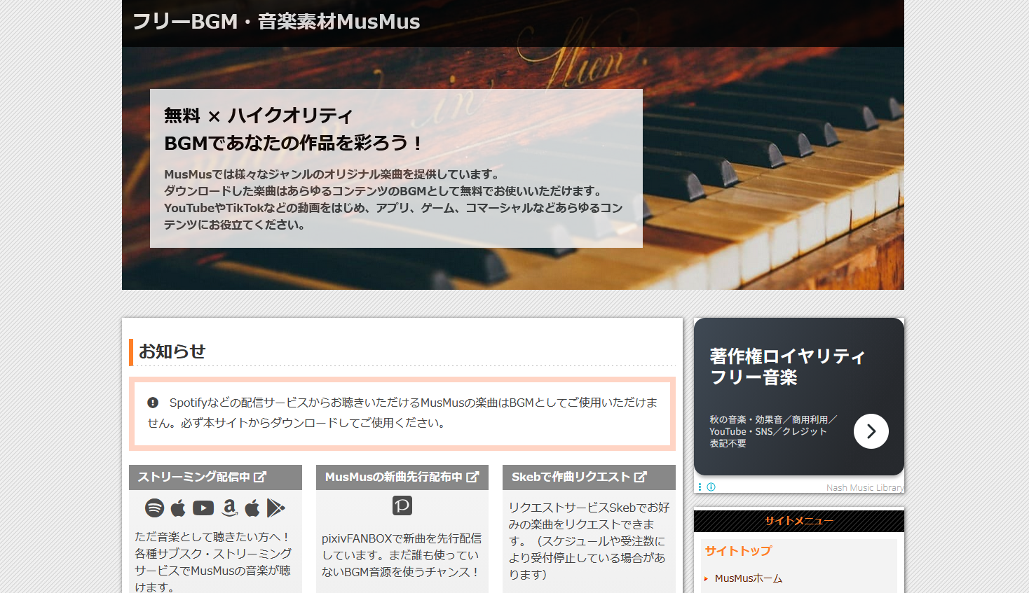 MusMusで配布されている楽曲を使用する場合、どのような場合でも著作権表記が必要となる点のみ注意が必要です。
