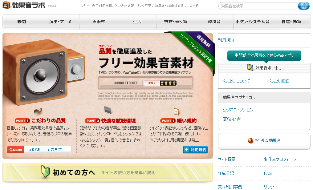 効果音ラボは、高品質な効果音を無料で配布しているWebサイトです。フリー音源サイトの中でも珍しい効果音に特化したサイトで「戦闘」「演出・アニメ」「声素材」「生活」「機械・乗り物」「環境音」「ボタン・システム音」「自然・動物」と、多種多様なジャンルの効果音が配布されています。プロの現場でも使用されるなど、その高い品質は業界でも一定の評価を得ています。