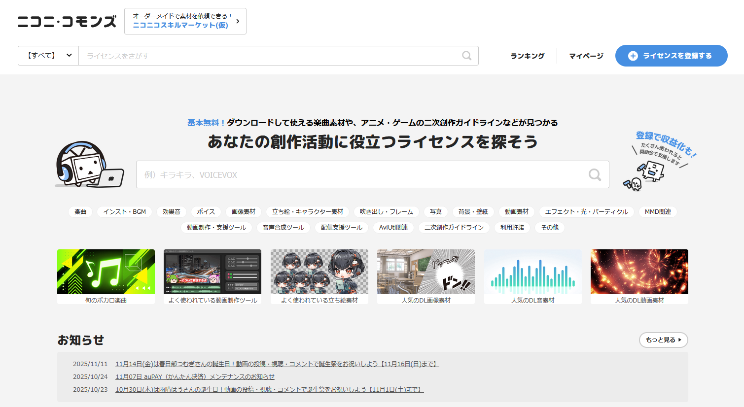 ニコニ・コモンズは、株式会社ドワンゴが運営している画像・音声・動画などを配布しているWebサイトです。利用するためにはニコニコアカウントが必要です。また、20歳以上のみ利用でき(14歳以上であれば条件を満たせば利用可)、使用する素材によって利用可能な範囲が異なる点に注意が必要です。