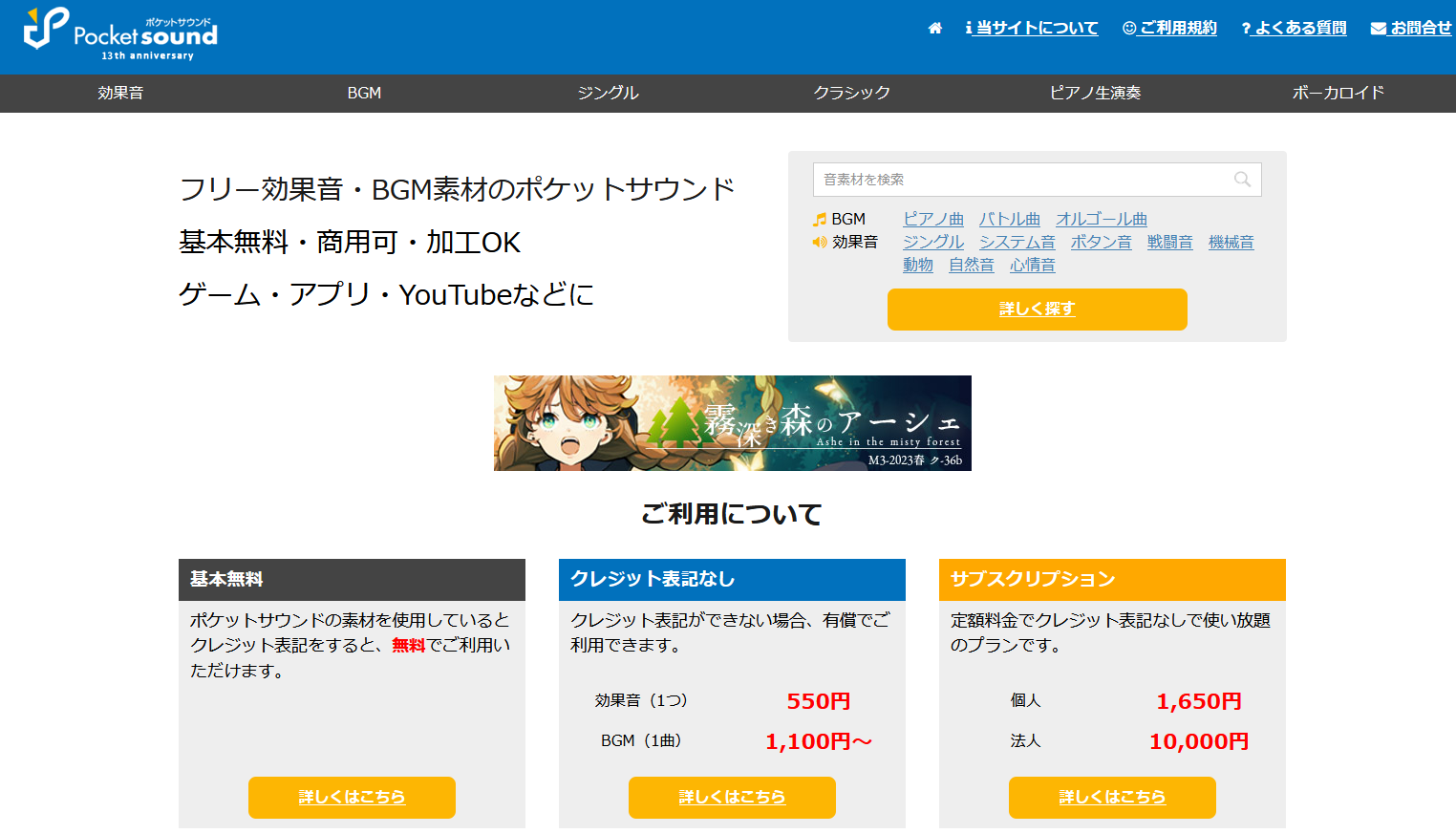 Pocket soundは、効果音やジングルからクラシック、ピアノ生演奏、ボーカロイドまで幅広いジャンルの音声を配布しているWebサイトです。提供されている幅広い楽曲は、クレジット表記をすると無料で使用することが可能です。