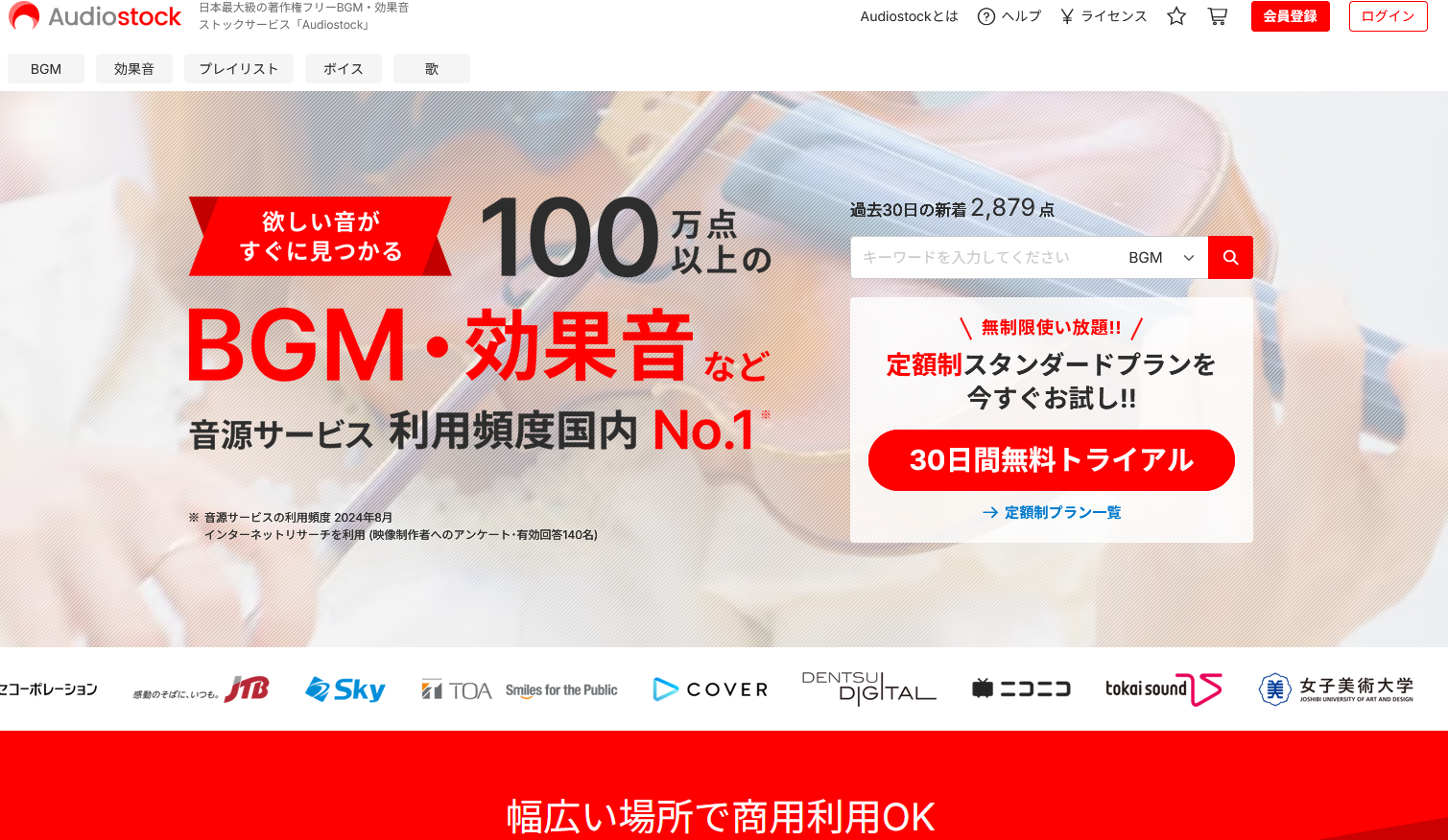 Audiostockは、BGM・効果音などサウンドクリエイターによって制作された作品が100万点以上配布されているWebサイトです。使用するためには単品もしくは月額プランで購入する必要がありますが、さまざまなジャンルで高いクオリティの楽曲が配布されています。