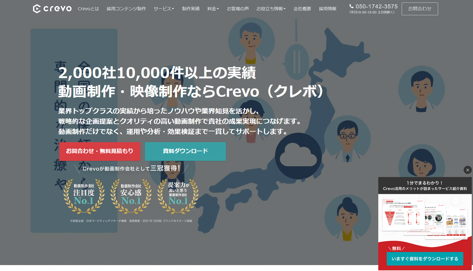 株式会社Crevoは、2,000社7,000件以上と、動画制作実績の豊富な動画制作会社です。同社では国内外に7,000人以上のクリエイターを抱えており、独自の制作管理ツールで制作にかかる工数を可能な限り削減することで、低コストかつハイクオリティな動画制作を実現しています。
