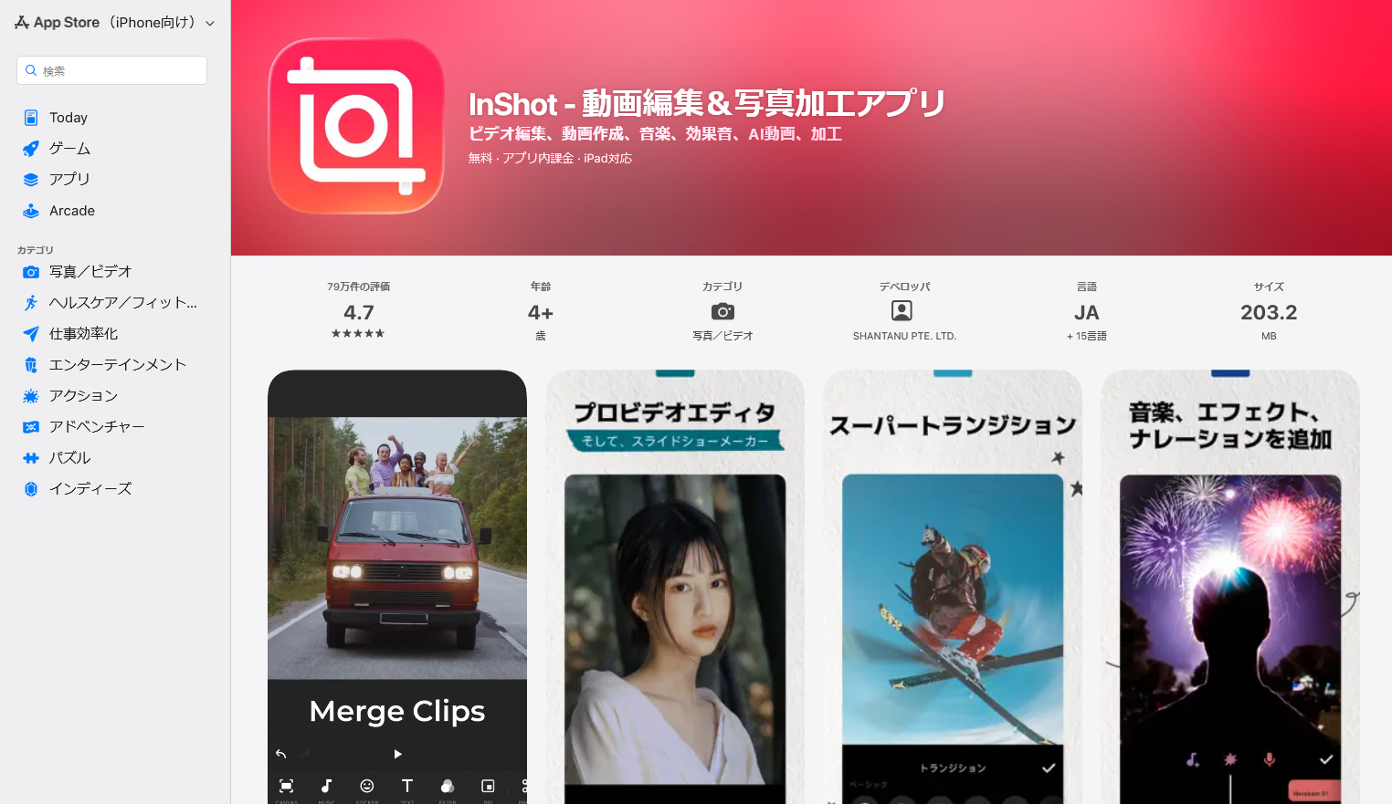 InShotは、機能や使いやすさから多くのユーザーに利用されています。iOSとAndroid、どちらにも対応しており、初心者でも簡単に編集ができるでしょう。スマホがあれば、外出先でも編集できる手軽さも特徴の一つです。無料のためカスタマイズの幅が狭く、BGMの選択肢も少ない点がデメリットといえるでしょう。