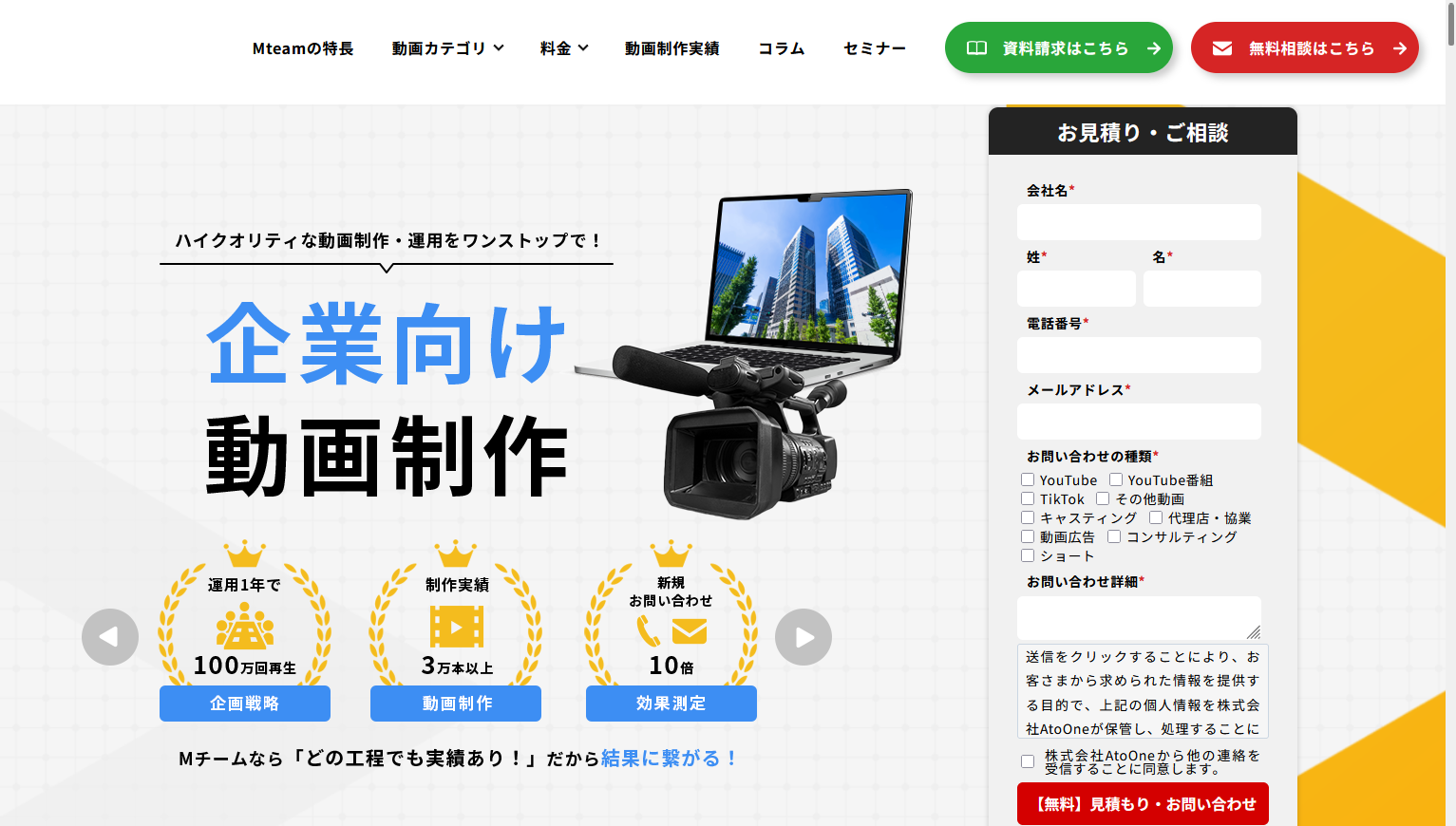 Mチーム(MTEAM)は、当社(株式会社AtoOne)が運営する動画制作サービスです。大手企業様からのご依頼も多数いただいており、ハイクオリティな動画制作からYouTubeチャンネル運用までワンストップで対応させていただきます。