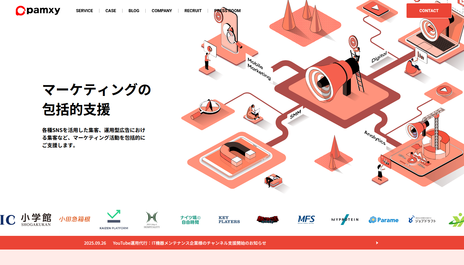 株式会社pamxyは、SNSを活用した集客、広告運用などを得意とする動画制作会社です。継続した広告運用をワンストップで依頼できるだけでなく、スポットでのコンサルティングを依頼することができる点も同社の特徴です。