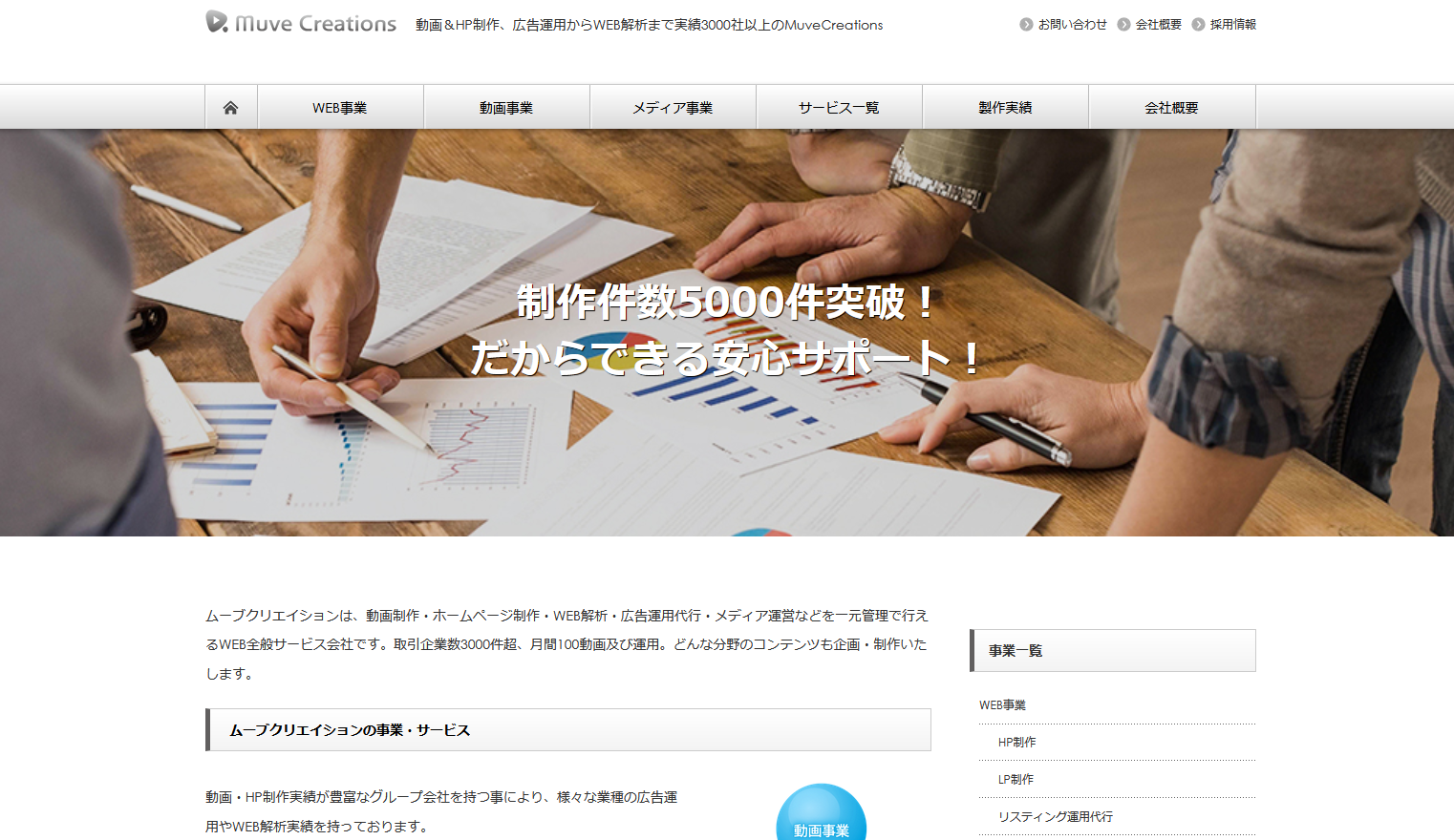株式会社Muve Creations(ムーブクリエイション)は、動画制作やホームページ作成、Web解析、広告運用、メディア運営など幅広い業務に対応しているWeb全般サービス会社です。月間100本以上の動画を制作・運用している実績もあり、安心して動画制作を依頼できます。