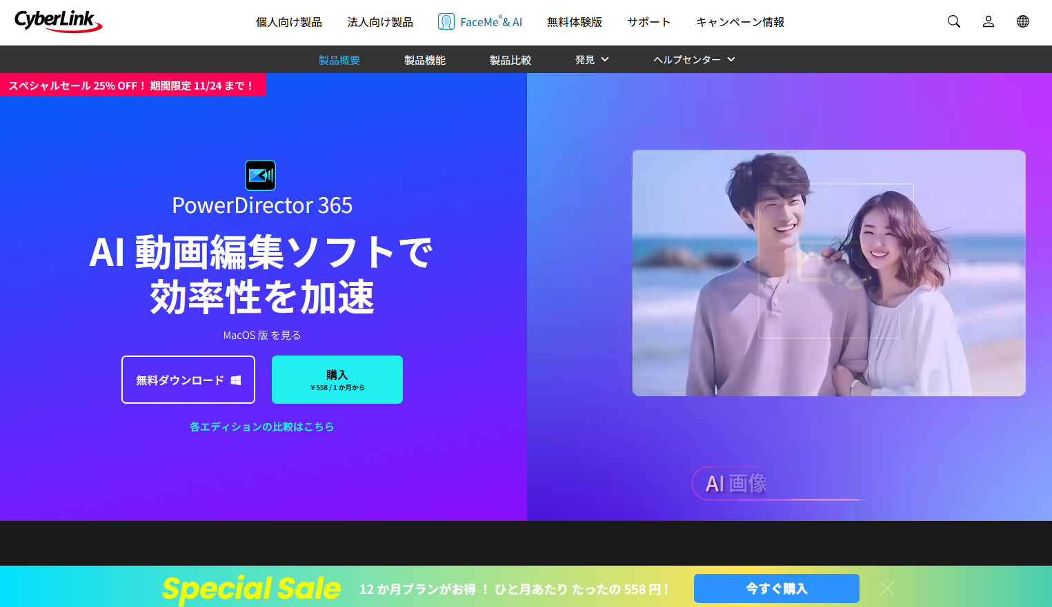 PowerDirector 365(パワーディレクター 365)は、初心者から上級者まで幅広く扱える動画編集ソフトです。世界中で約2億人に利用されています。日本でも個人や企業など幅広いユーザーが使用しており、汎用性の高さはトップクラスといえるでしょう。